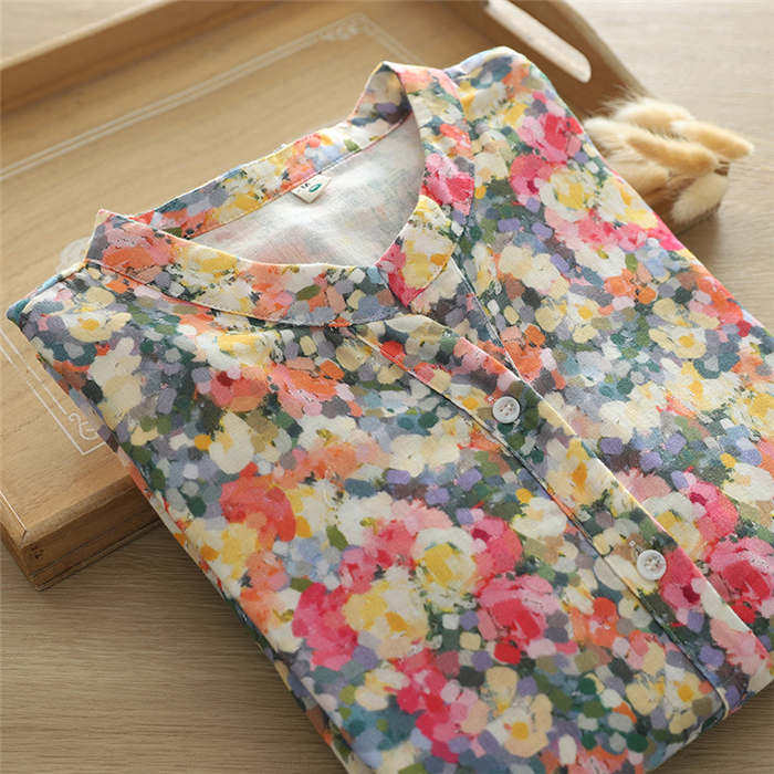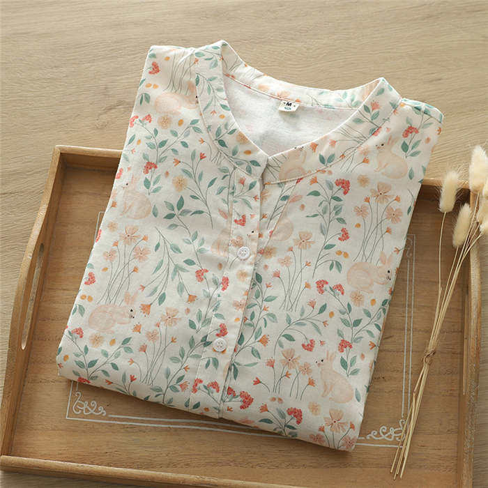 総柄 バンドカラー ガーゼ シャツ レ