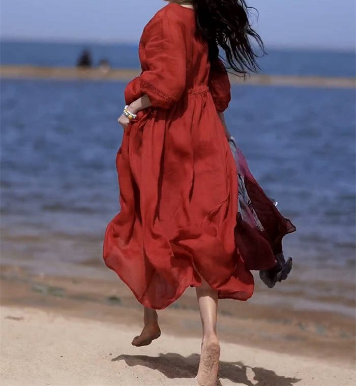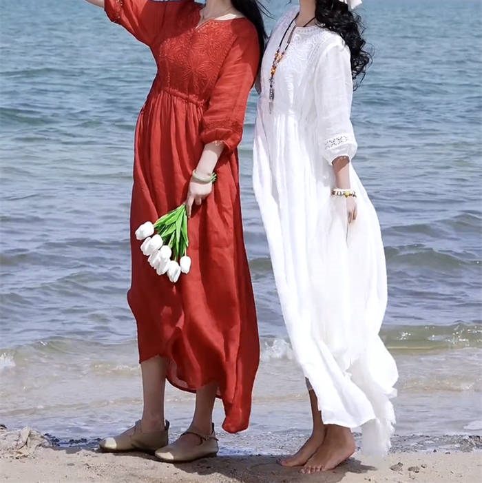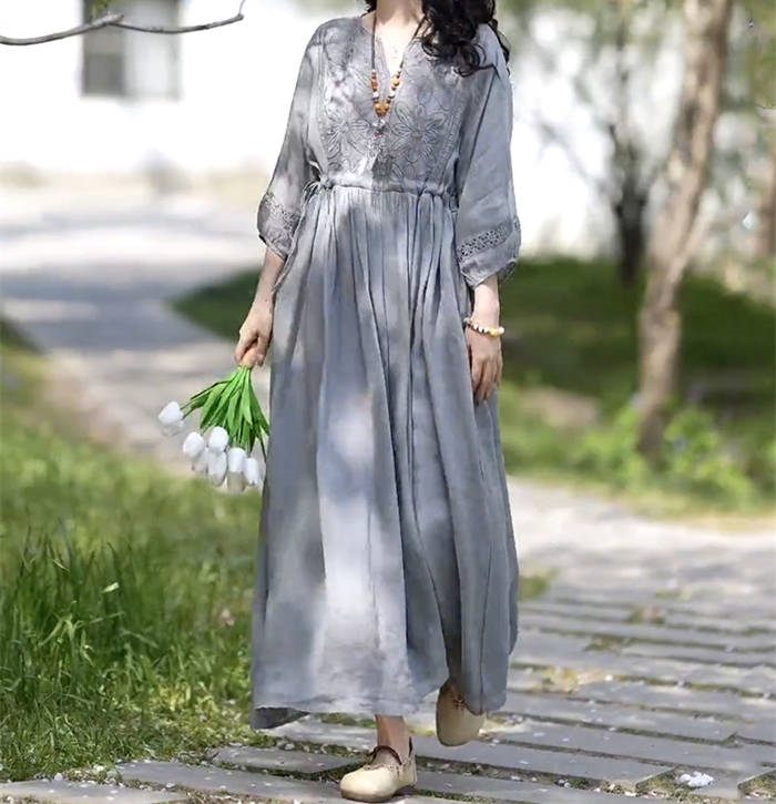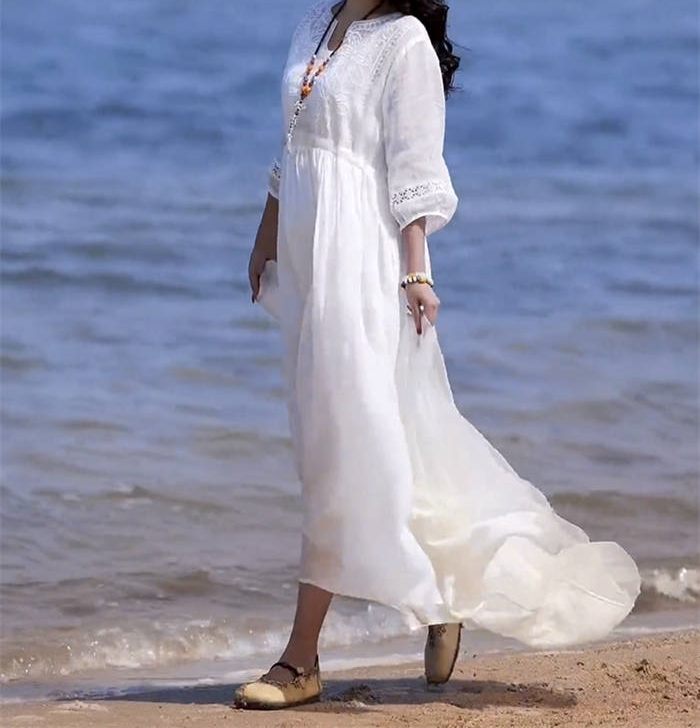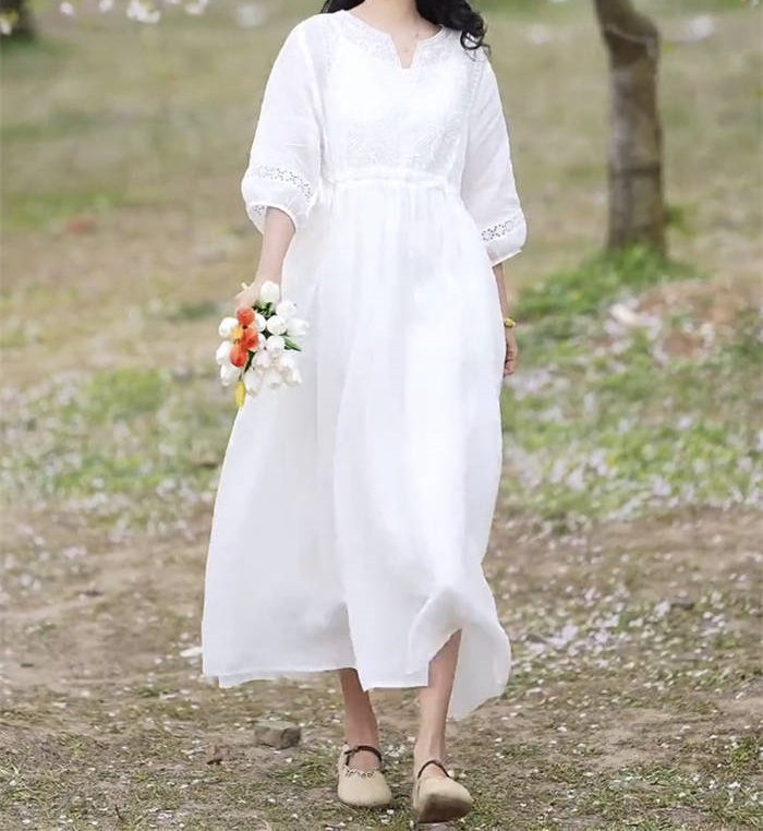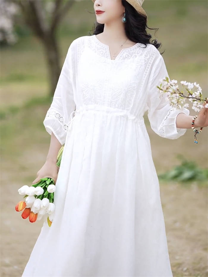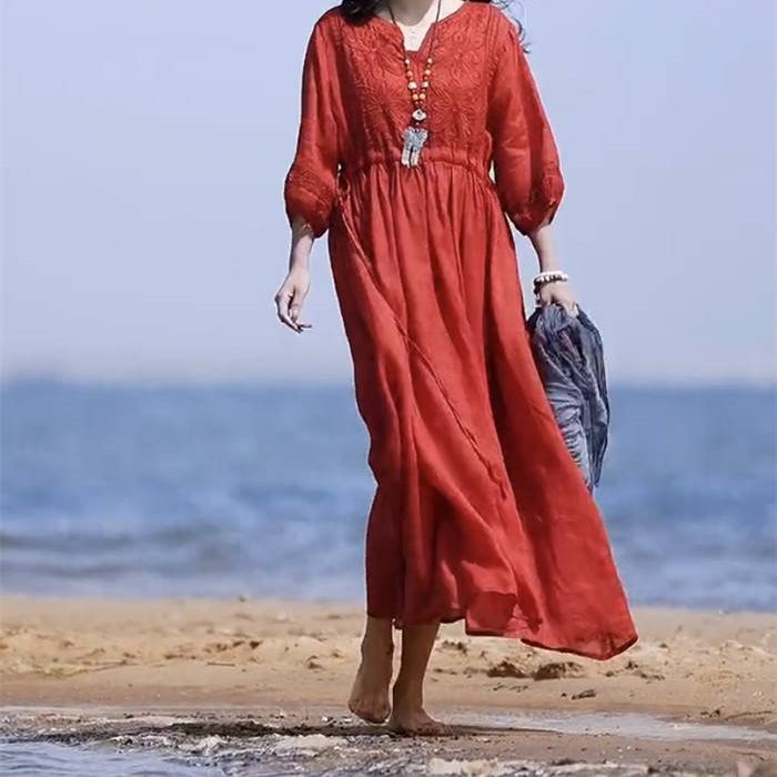 ワンピース レディース 夏 麻 七分袖