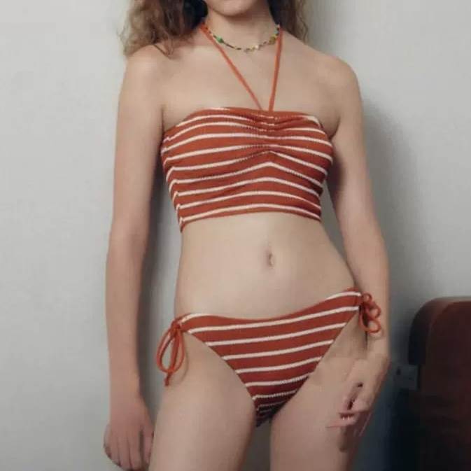 レトロな雰囲気漂う、ホルターネックのビキニ水着です。おしゃれなボーダー柄で、大人可愛いスタイルを演出します。パッド入りで安心感も抜群で、ビーチやプールサイドでのレジャータイムをより楽しいものにしてくれること間違いなしのアイテムです。