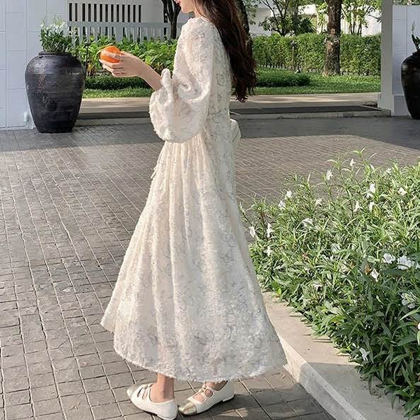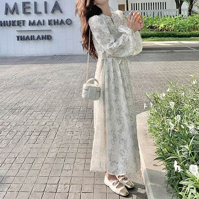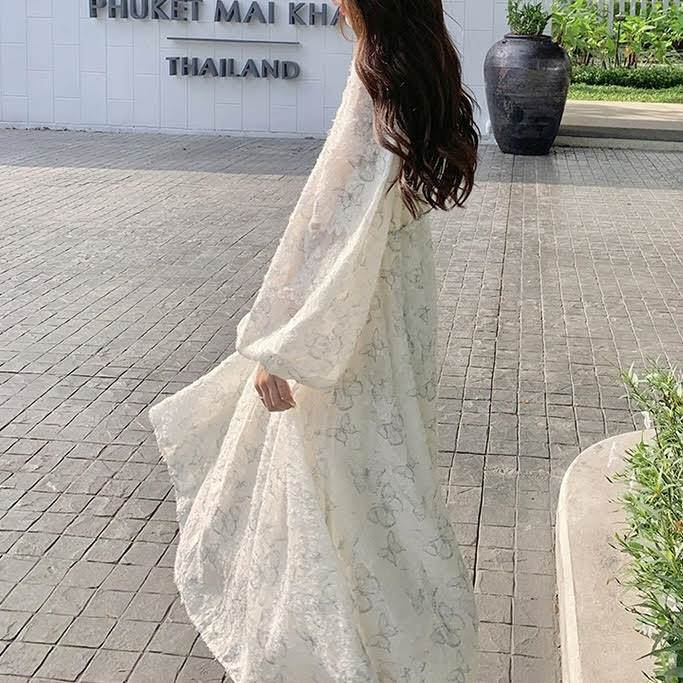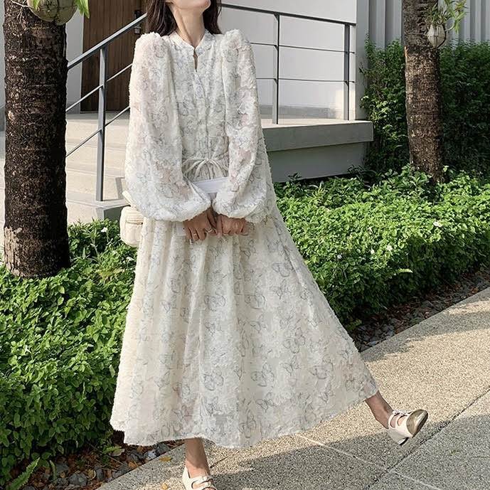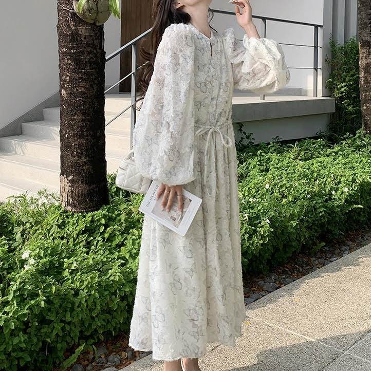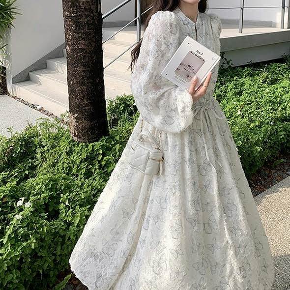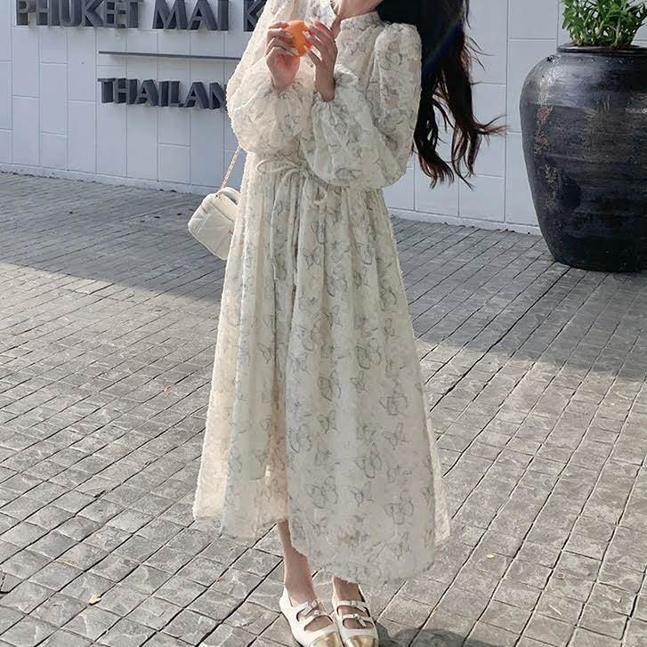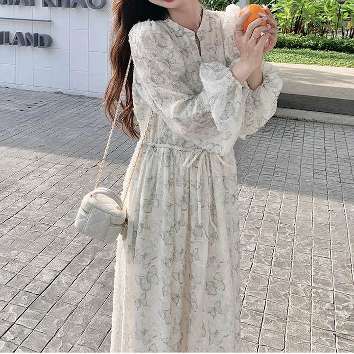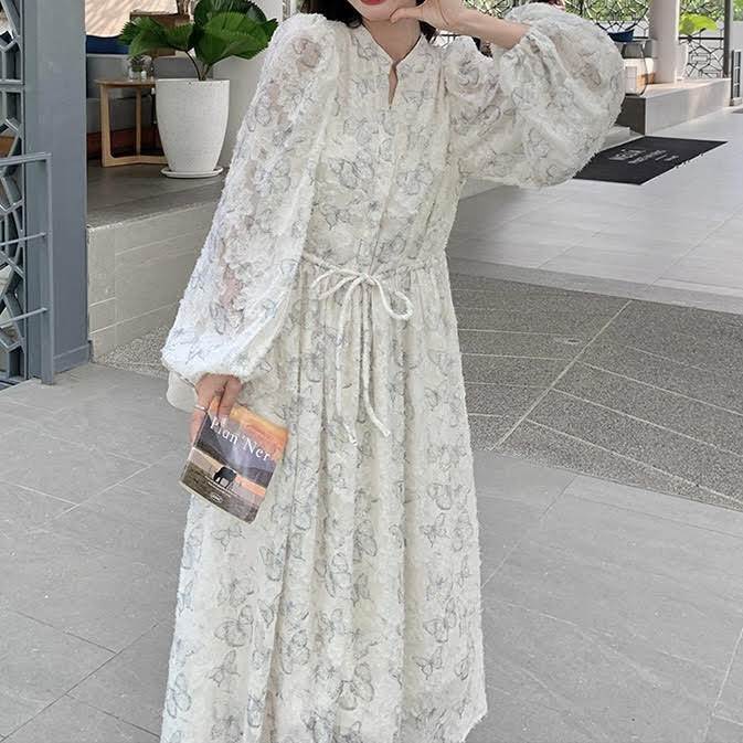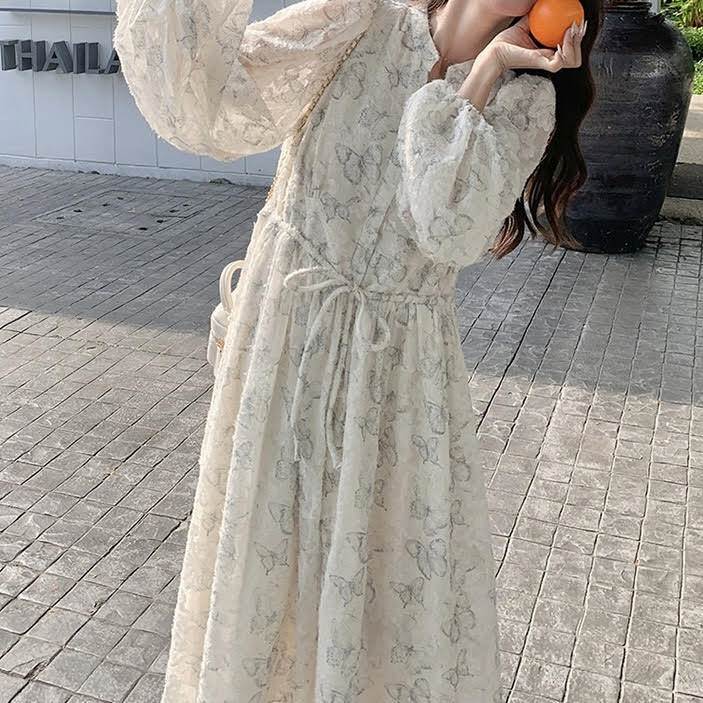 レディース ワンピース 長袖 ランタンスリーブ ロング丈 バタフライ 蝶 プリント Aライン ウエストリボン ルーズ きれいめ 上品 おしゃれ お洒落 シンプル カジュアル 大人可愛い 大人女子 かっこいい スタイリッシュ キュート ラブリー ガーリー フェミニン レトロ 主役級 存在感 こなれ感 抜け感 春 秋 10代 20代 お出かけ デート 女子会 お泊まり 旅行 休日 ショッピング 普段使い デイリー 韓国 オルチャン ファッション コーデ トレンド スタイルアップ S M L XL ホワイト