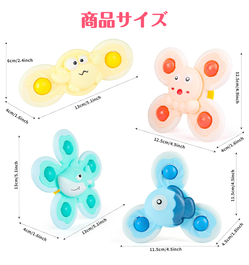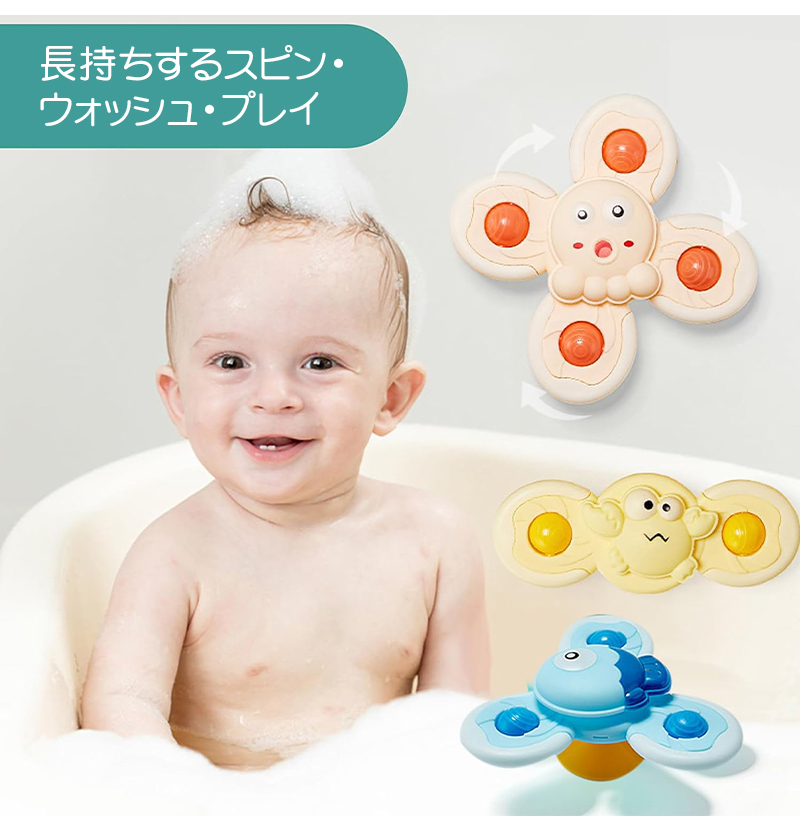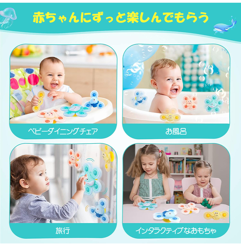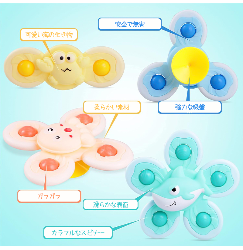 赤ちゃんのための安全: 吸引回転おもちゃは高品質のプラスチックABSで作られており、無毒で、乳児に安全です。耐久性のあるベアリングはナイロン素材で作られています。それは電池を必要としない。滑らかな表面、バリや角がなく、赤ちゃんの繊細な手を保護します。幼児の注意を引き付け、彼らの興味を喚起することは容易であることができるジングルベルが付いている4つの異なった海の動物の形の浴槽のおもちゃ。