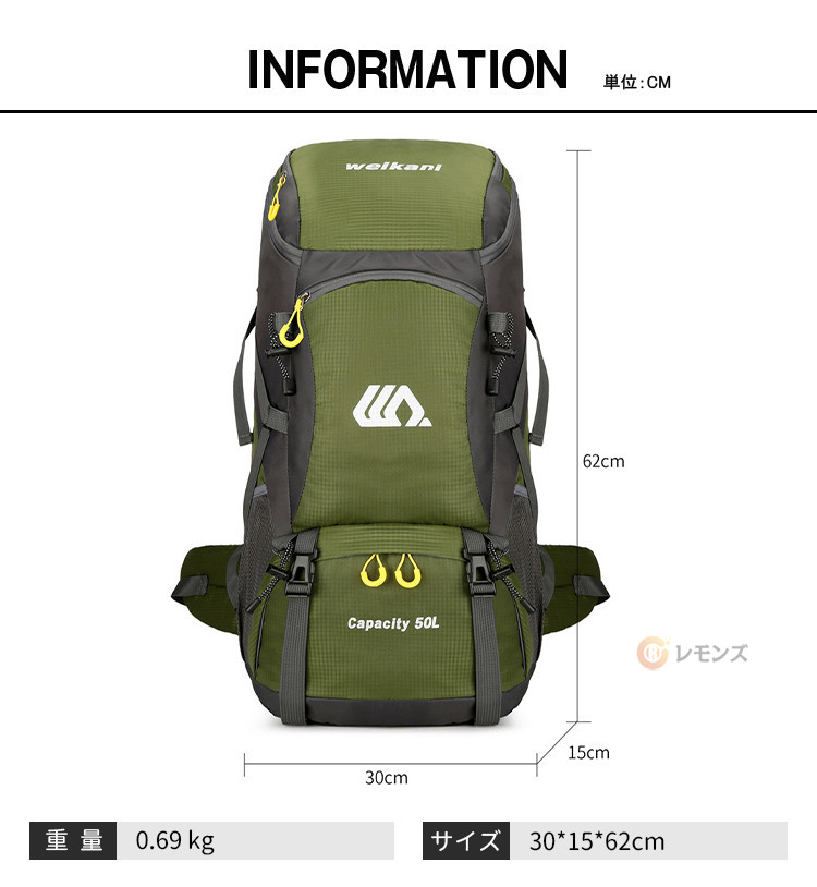 ※※ベルト、飾りやインナーなどは含みません。商品情報商品名 バックパック リュック 大容量 リュックサック メンズ レディース 50L 防災 リュック アウトドア 防水 登山リュック 遠足 旅行 出張 カバン 多機能 ティパック リュック プレゼント トレッキング ギフト 男女兼用 メンズ ザック素材 防水ナイロンカラー 50Lサイズ 各サイズの寸法については画像のサイズ表にご参照ください。生産国 中国包装について 環境保護の観点から、「簡易包装」を推進しております明細書について 当店ではエコロジーと個人情報流出防止のため、ご指示の無い限り明細書を発行しておりません。