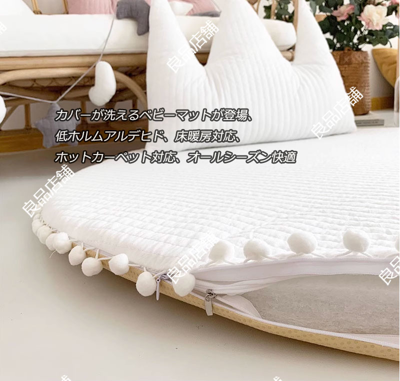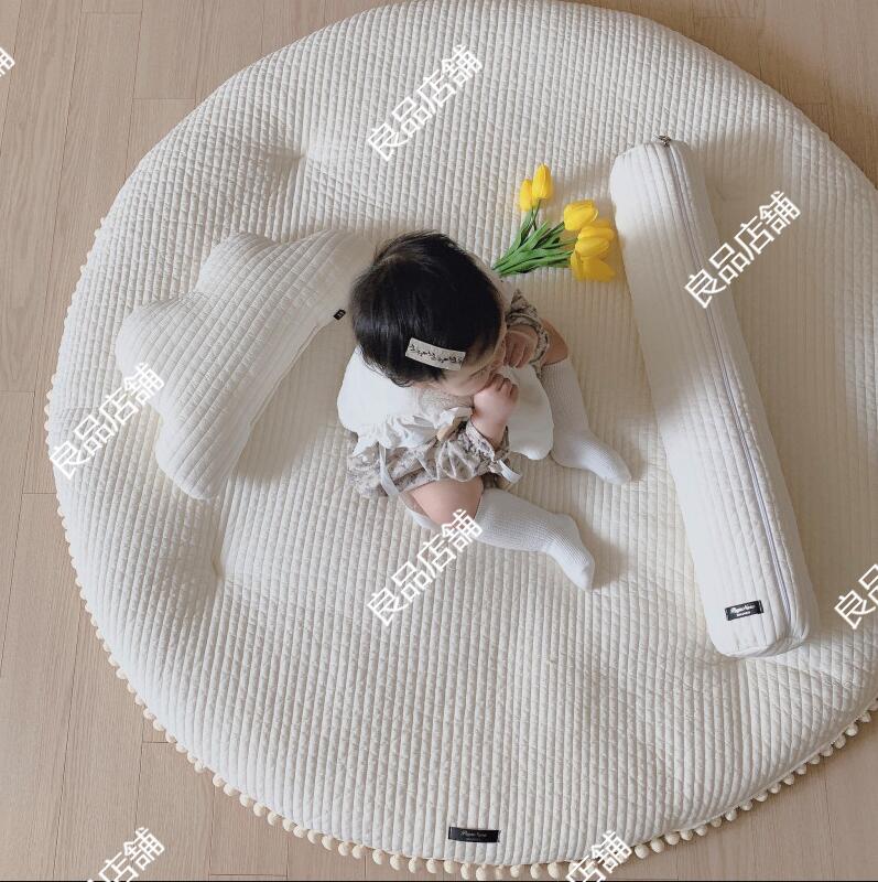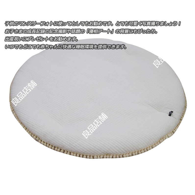 上質なイブル素材を使用した洗える丸型クッションマット<ラウンドラグマット> ベビーのプレイマットとしてやペットマットとして、インテリアとしても人気です。高密度でしっかりと織られた肌ざわりのよいコットン100%の生地、表面は100番手の糸で織られた生地を使用しております。糸は細くきめ細かやで、肌触り抜群の生地になり、その分高級とされています。