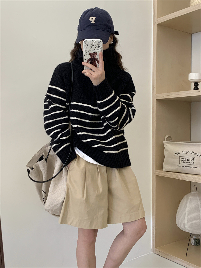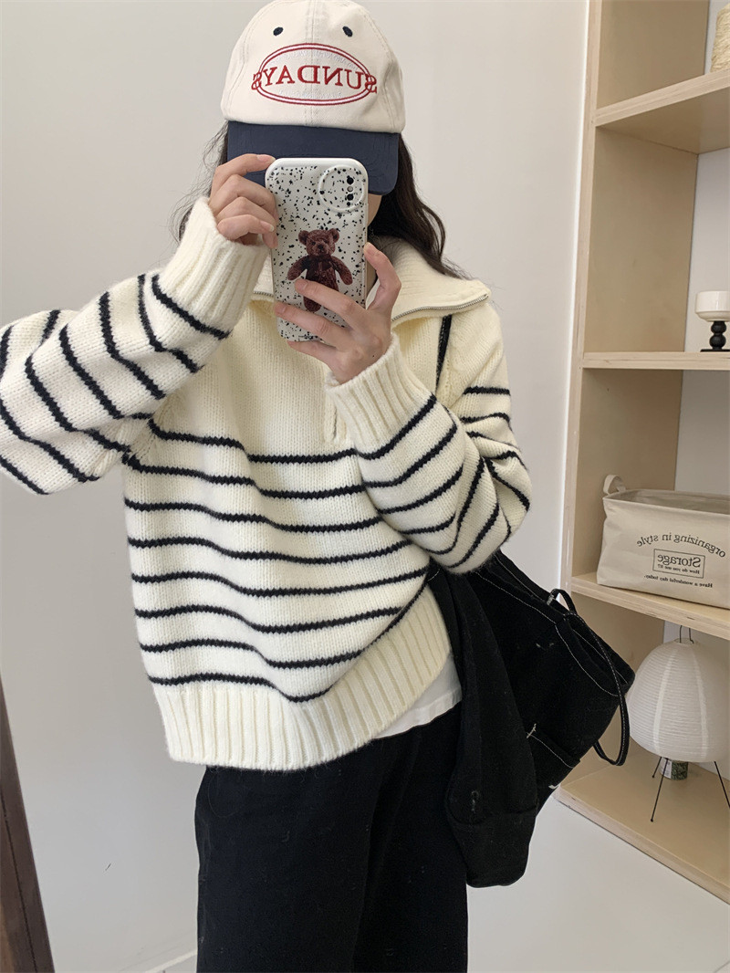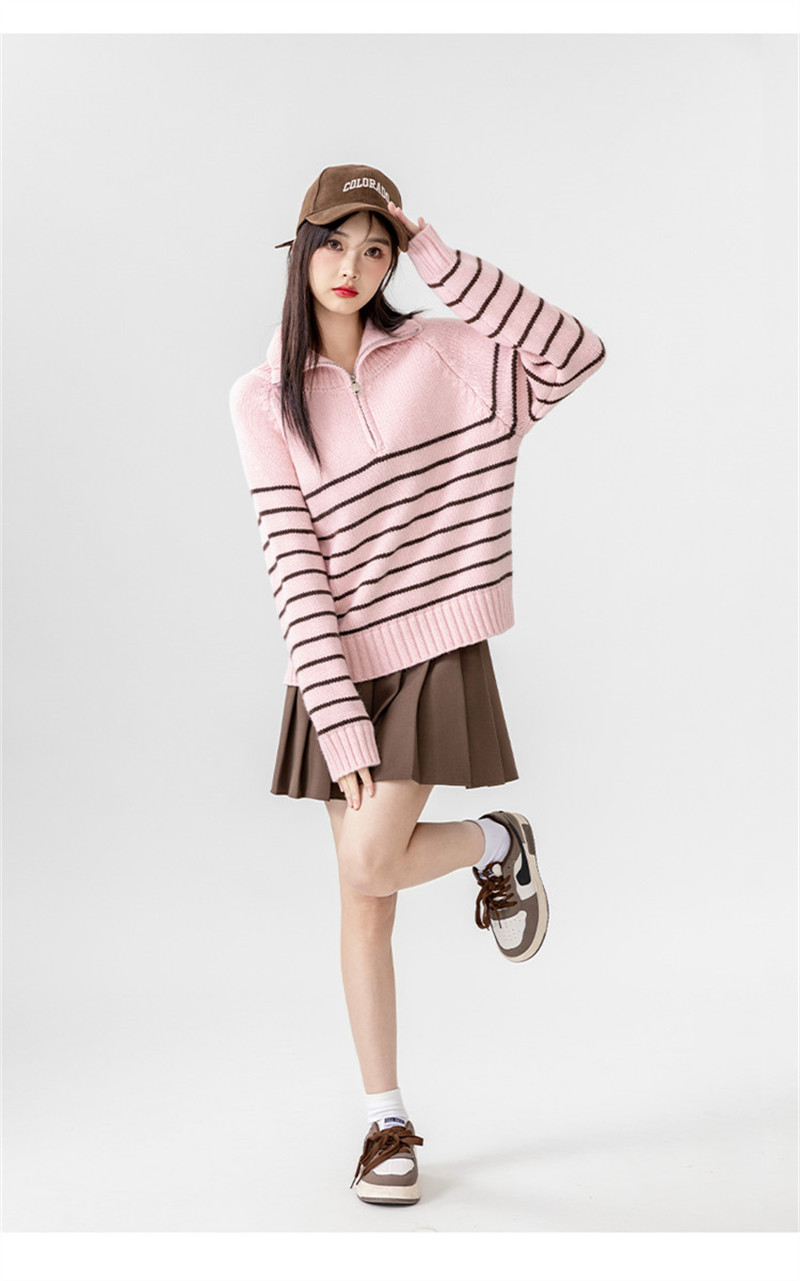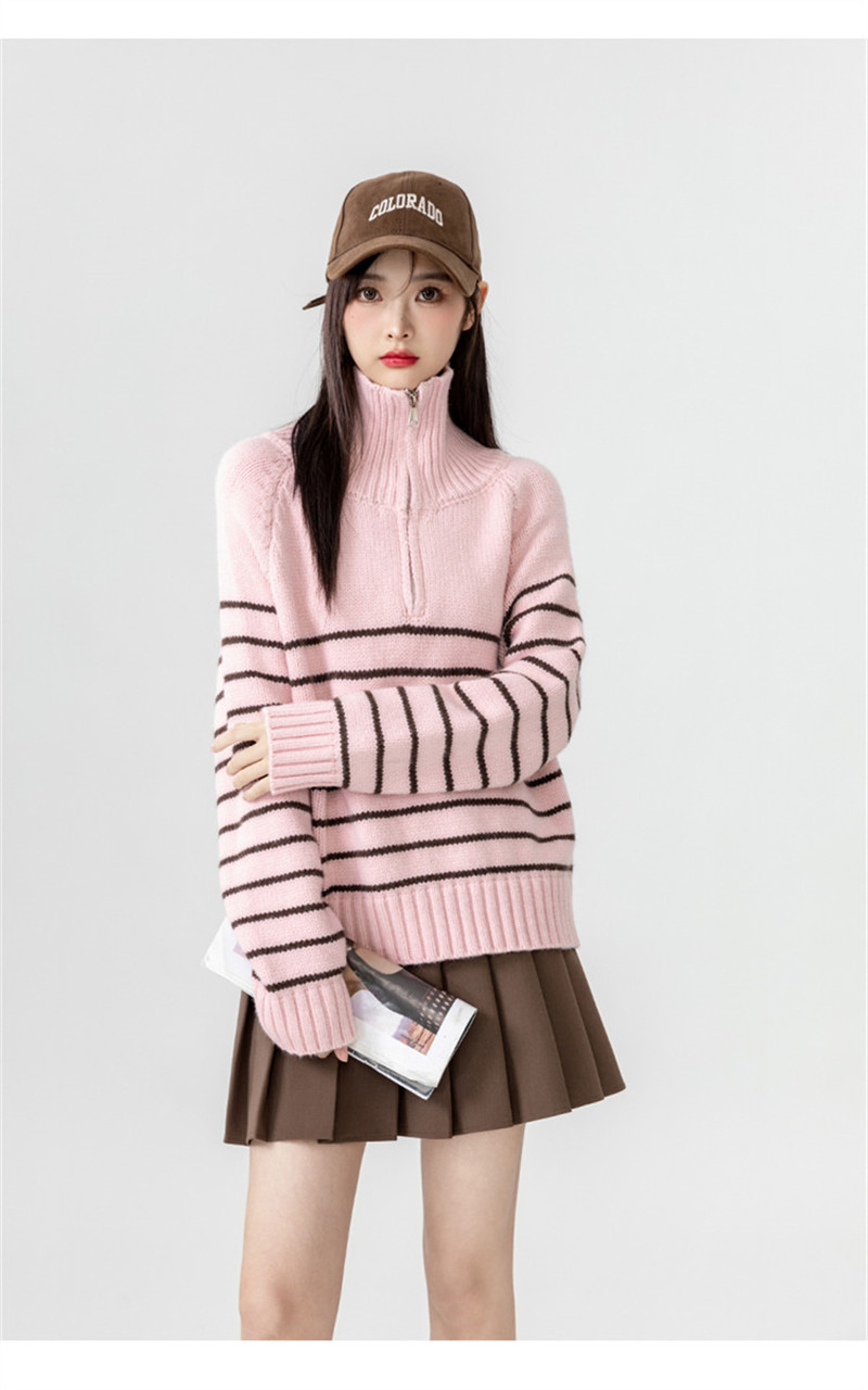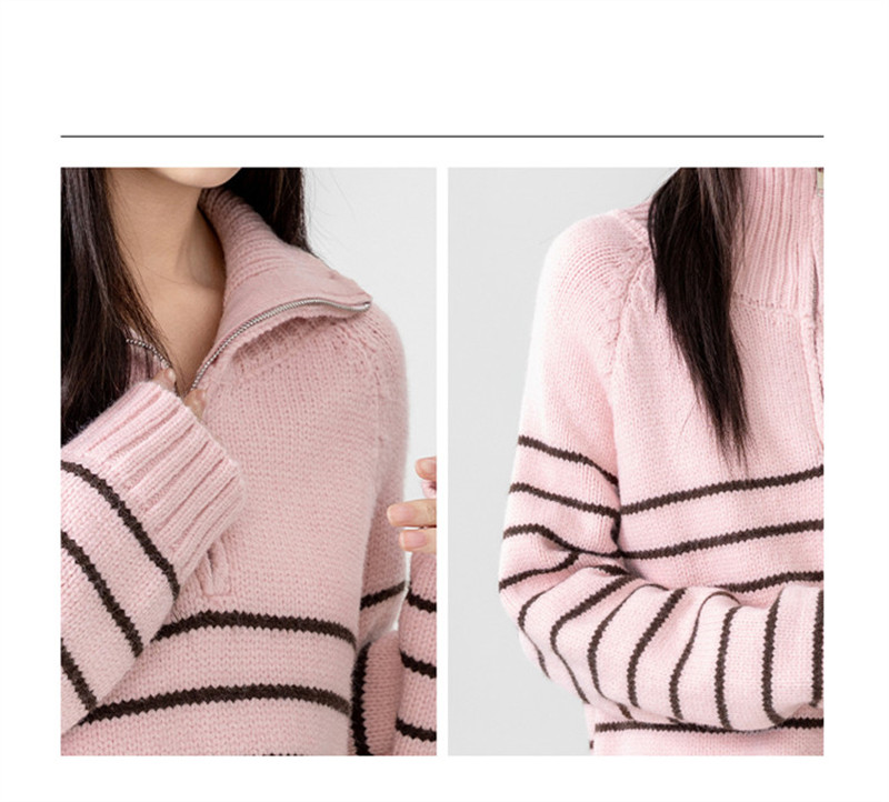 ニット レディース トップス セーター プルオーバー 大きいサイズ 秋冬 ゆったり ハーフジップ シルエット 長め タートルネック ハイネック 長袖 ボーダー
