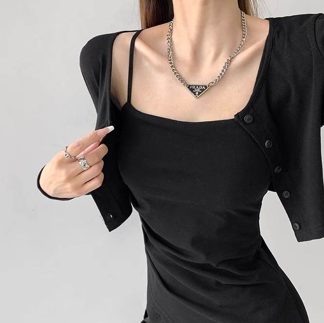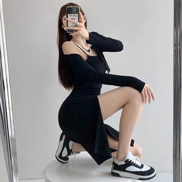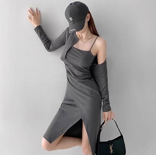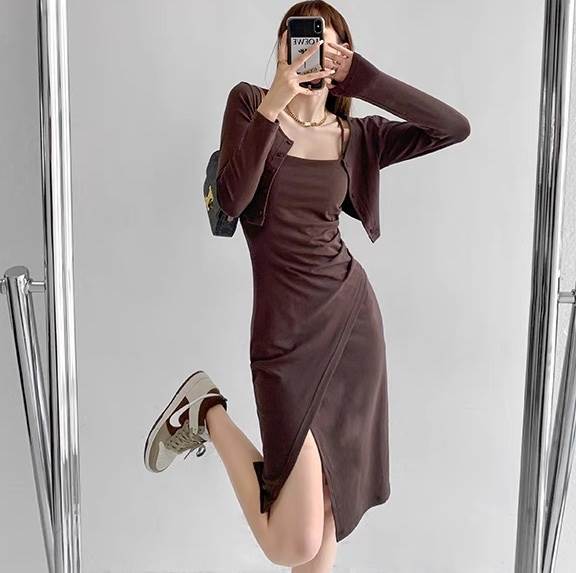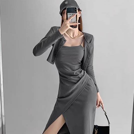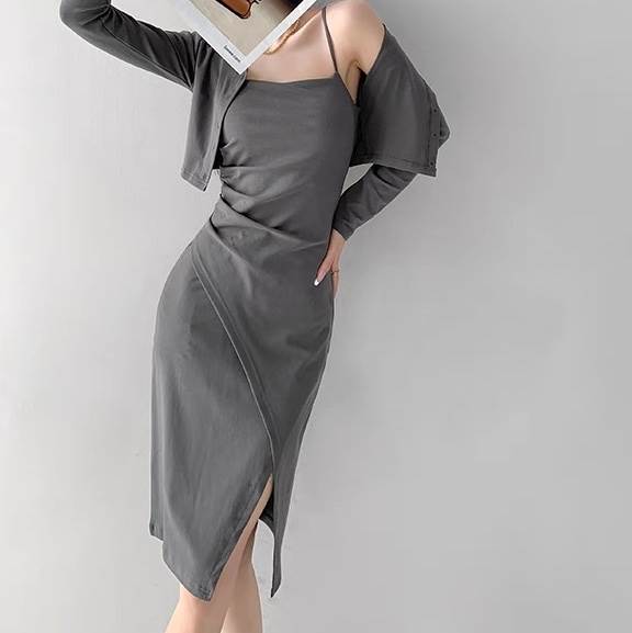 2点セット トップス ワンピース カーディガン レディース 羽織 前開き 膝丈 アシンメトリー 袖なし ノースリーブ 長袖 タイト スリム 細身 スマート フェミニン ストリート スリット