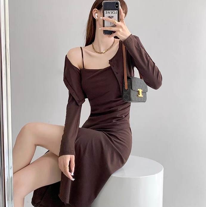 レイヤードシックな2点セットのキャミワンピとカーディガン。