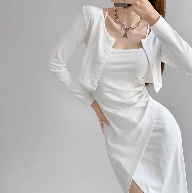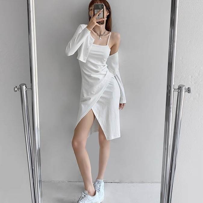 2点セット トップス ワンピース カーディガン レディース 羽織 前開き 膝丈 アシンメトリー 袖なし ノースリーブ 長袖 タイト スリム 細身 スマート フェミニン ストリート スリット サイドスリット かわいい 大人可愛い きれいめ シンプル カジュアル おしゃれ こなれ感 ラフ ガーリー クール 無地 春 夏 秋 お出かけ イベント リゾート ビーチ 休日 重ね着 普段使い 着回し レイヤード トレンド 流行 インスタ映え S M 白 ホワイト 黒 ブラック 茶色 ブラウン グレー ベージュ ピンク