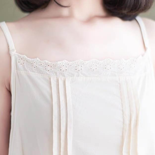 スクエアネックとレース、刺繍がフェミニンで大人可愛い印象を演出し、シンプルながらも上品でおしゃれなスタイルを実現。