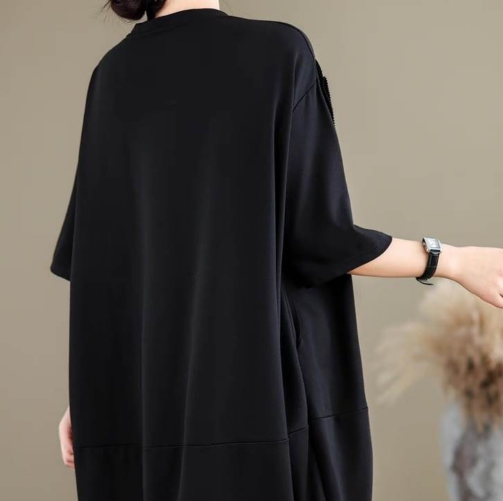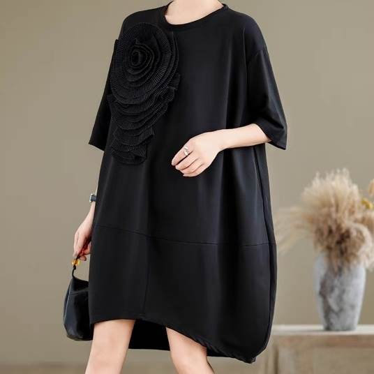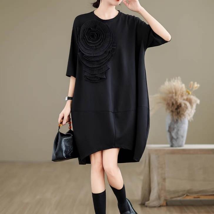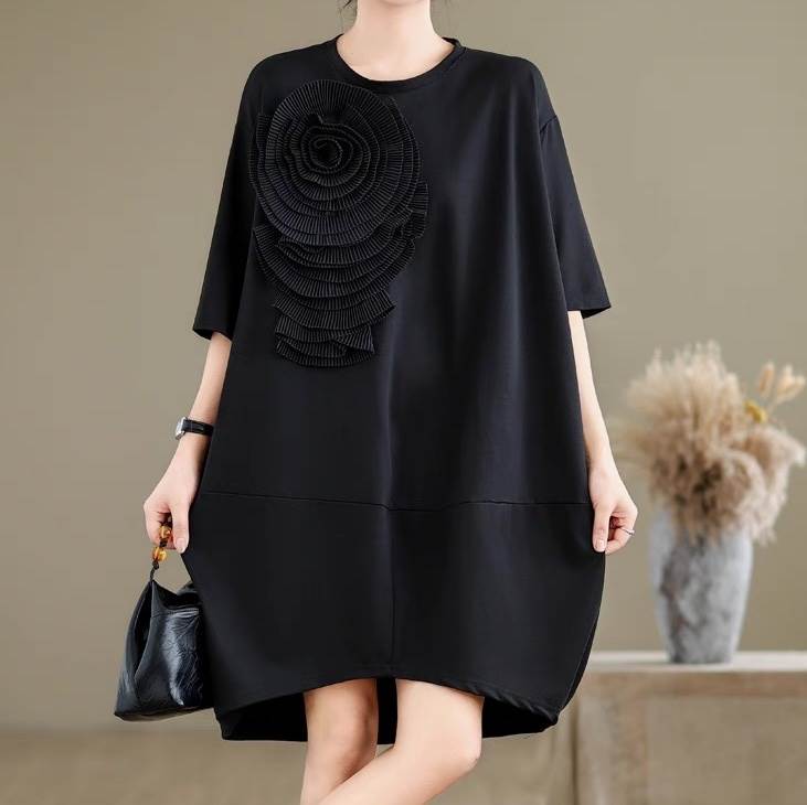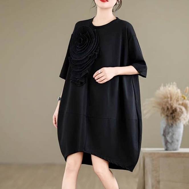 ワンピース レディース 膝丈 5分袖 ラウンドネック オーバーサイズ コクーン フェミニン ローライズ ウエストマーク かわいい 大人可愛い 上品 おしゃれ レトロ こなれ感 エレガント モダン 存在感 ヴィンテージ ラブリー キュート クラシカル ロマンティック ナチュラル フラワー 春 夏 デート お出かけ イベント レストラン 女子会 休日 ショッピング カフェ 体型カバー 美脚 脚長 普段使い 着回し トレンド 流行 インスタ映え L XL 大きいサイズ ビッグ ゆったり ゆる 黒 ブラック