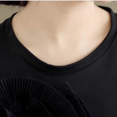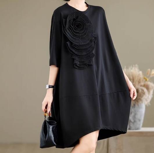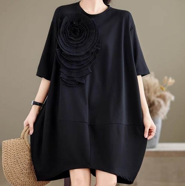 大きい花モチーフ、5分袖とラウンドネックで、春夏のお出かけに最適な一着。