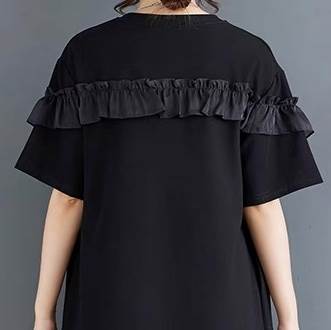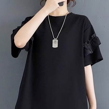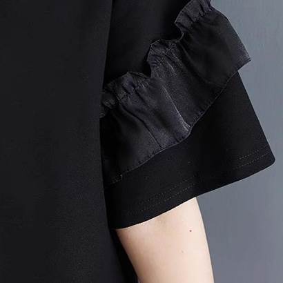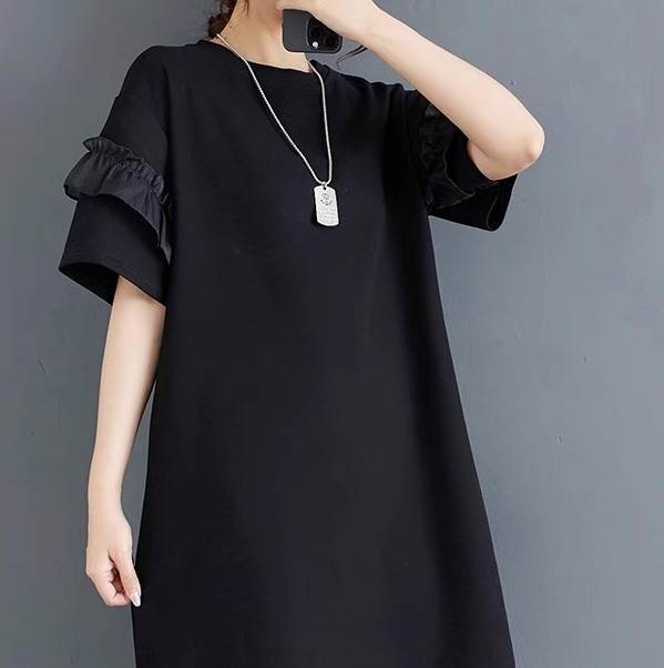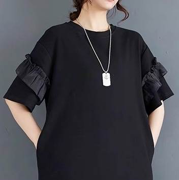 フリル袖の膝丈フレアTシャツワンピース。