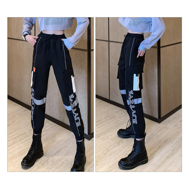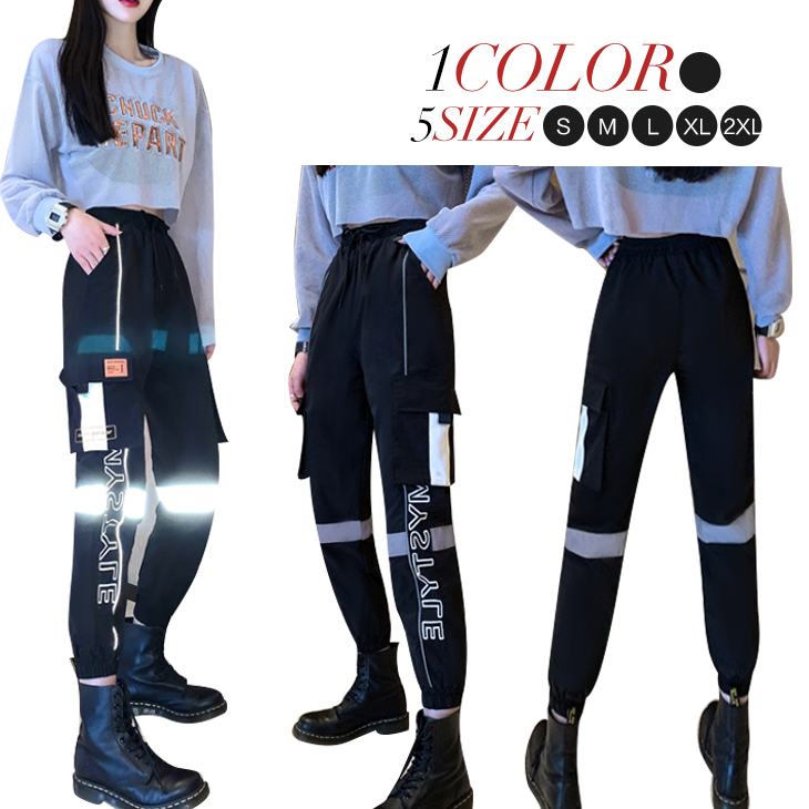 レディース パンツ ダンス ジョガーパンツ 発色 発光 反射材付き トラックパンツ 反射材 英ロゴ 英文字 ブラック