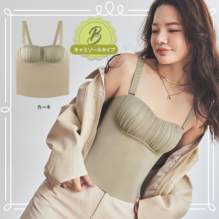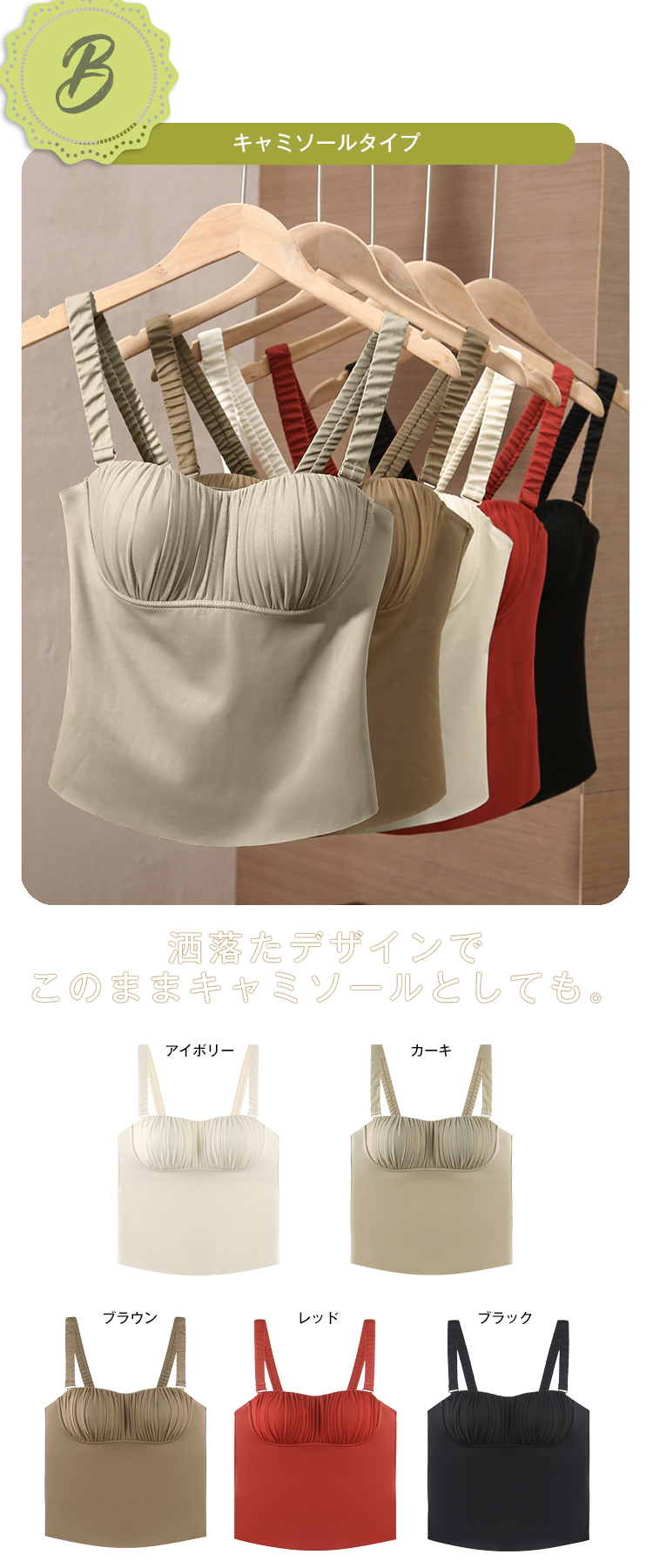 02: A:(ブラ)-アイボリー A:(ブラ)-カーキ A:(ブラ)-ブラウン A:(ブラ)-レッド A:(ブラ)-ブラック B:(キャミソール)-アイボリー B:(キャミソール)-カーキ B:(キャミソール)-ブラウン B:(キャミソール)-レッド B:(キャミソール)-ブラック