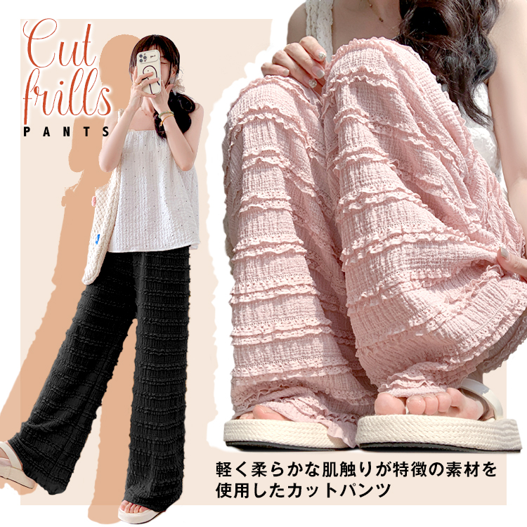 カットフリル ワイドパンツ レディース ハイウエスト ワイドパンツ ミルフィーユ レース フリル ボトムス 春夏 ゆるふわ フレアパンツ ロング丈 ウエストゴム レイヤード 重ね着