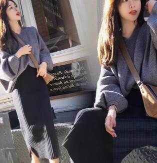 セットアップ プルオーバー タイトスカート ニットスカート トップス スカート ボトムス ミモレ丈 袖あり 長袖 ボリューム袖 萌袖 ランタンスリーブ Vネック スリム ハイウエスト