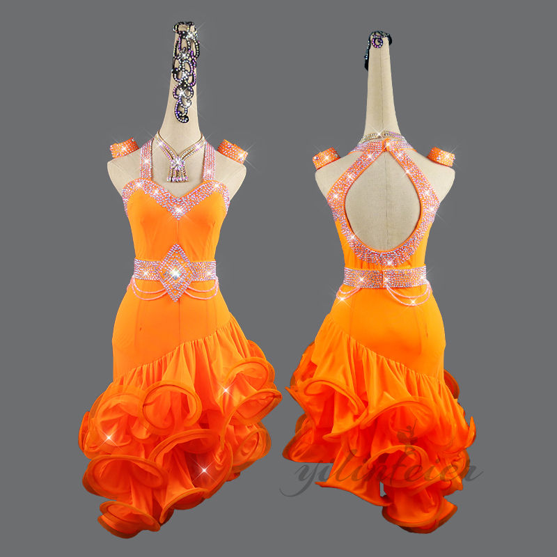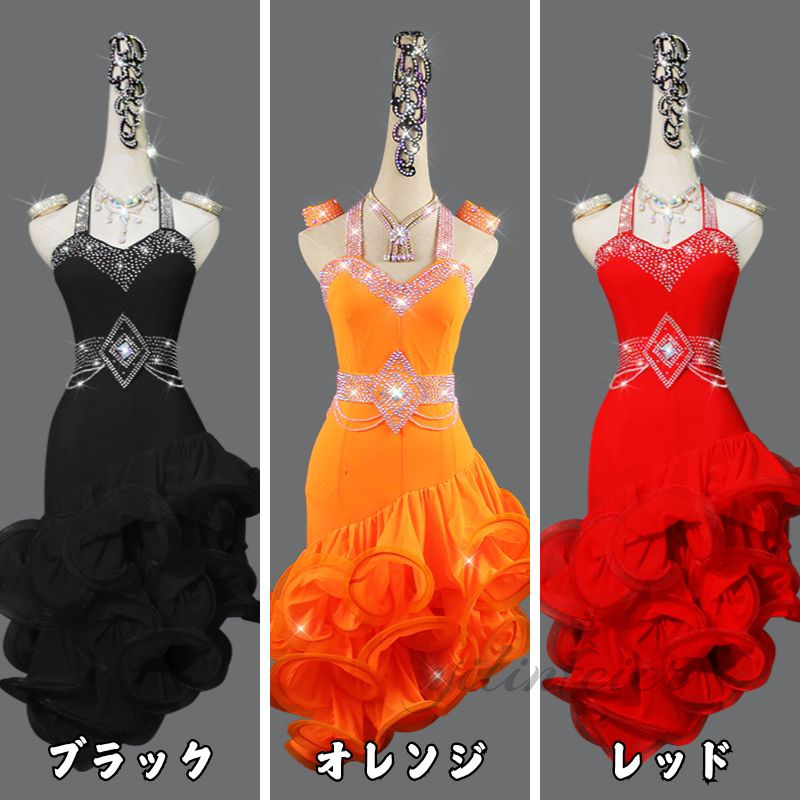 このドレスは、キラキラと輝くラインストーンが施され、ダンスの動きを美しく引き立てます。色鮮やかなオレンジ、クラシックなブラック、情熱的なレッドの3色展開で、それぞれの色が持つ独特の魅力を放ちます。