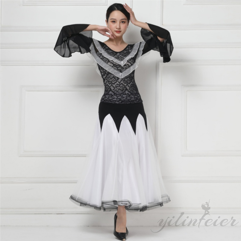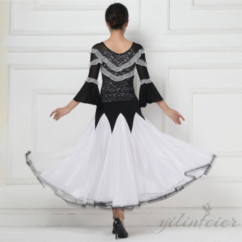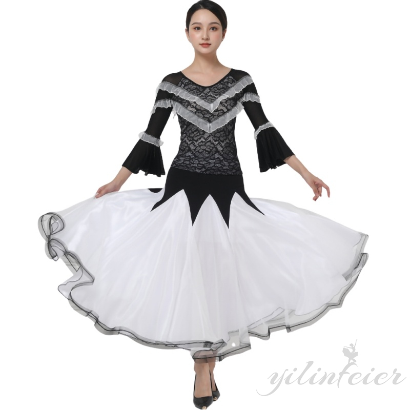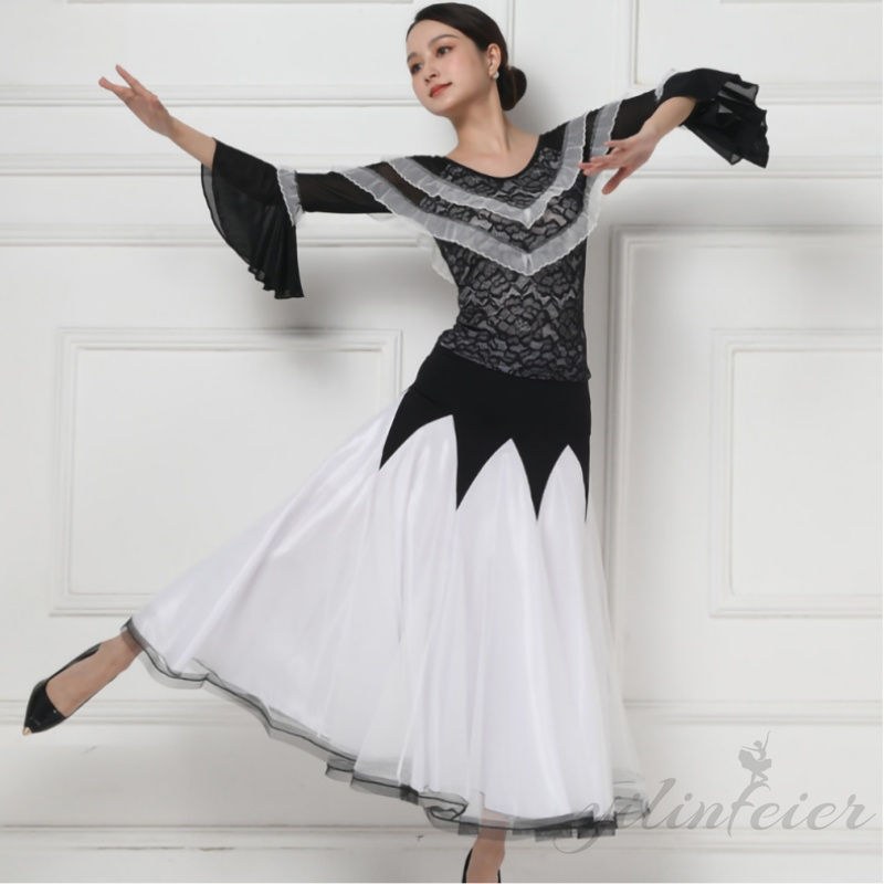★この社交ダンス衣装は、ラテンダンスからモダンダンスまで、あらゆるダンスシーンで輝くためにデザインされています。エレガントなブラックとホワイトのコントラストが特徴で、練習から本番まで幅広く活躍します。トップスには繊細なレースが施され、動きに合わせて美しく揺れるフリルが腕の動きをより魅力的に演出。スカートの裾には軽やかなフリルが加えられ、回転するたびに優雅な波紋を描きます。スカート部分は広がりのあるデザインで、ダンス中のあらゆる動きを美しく表現します。