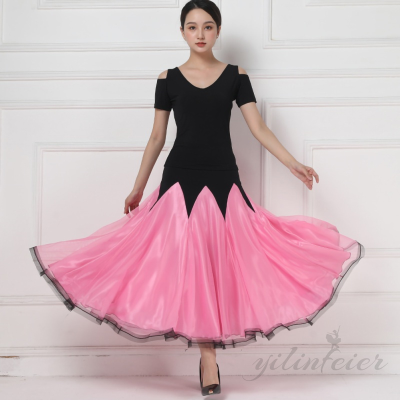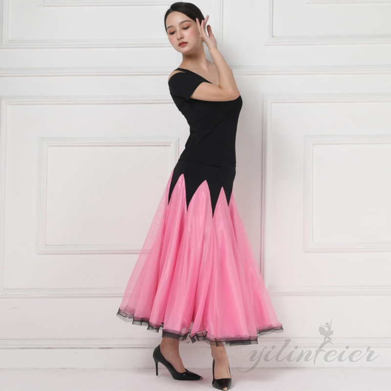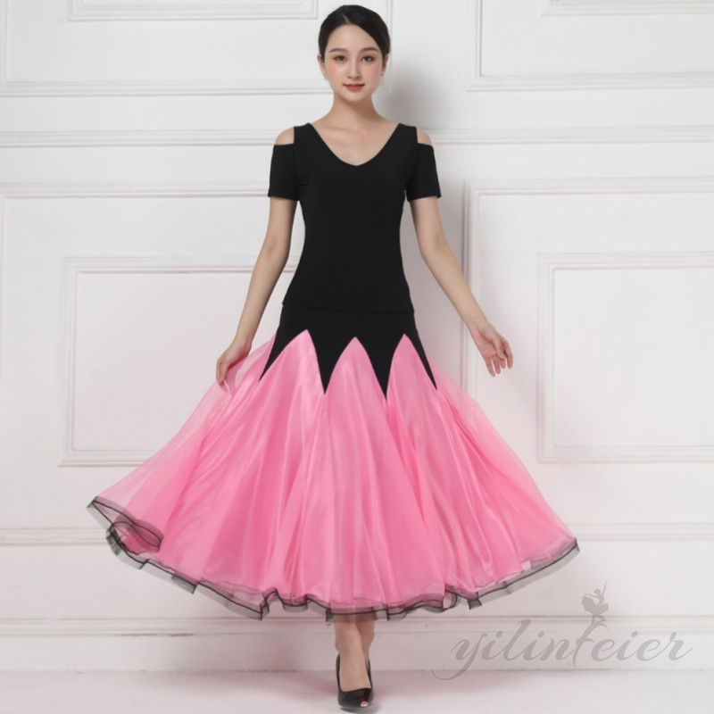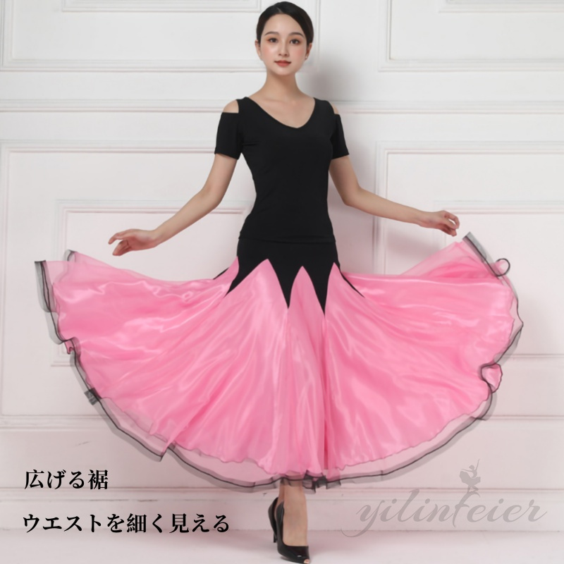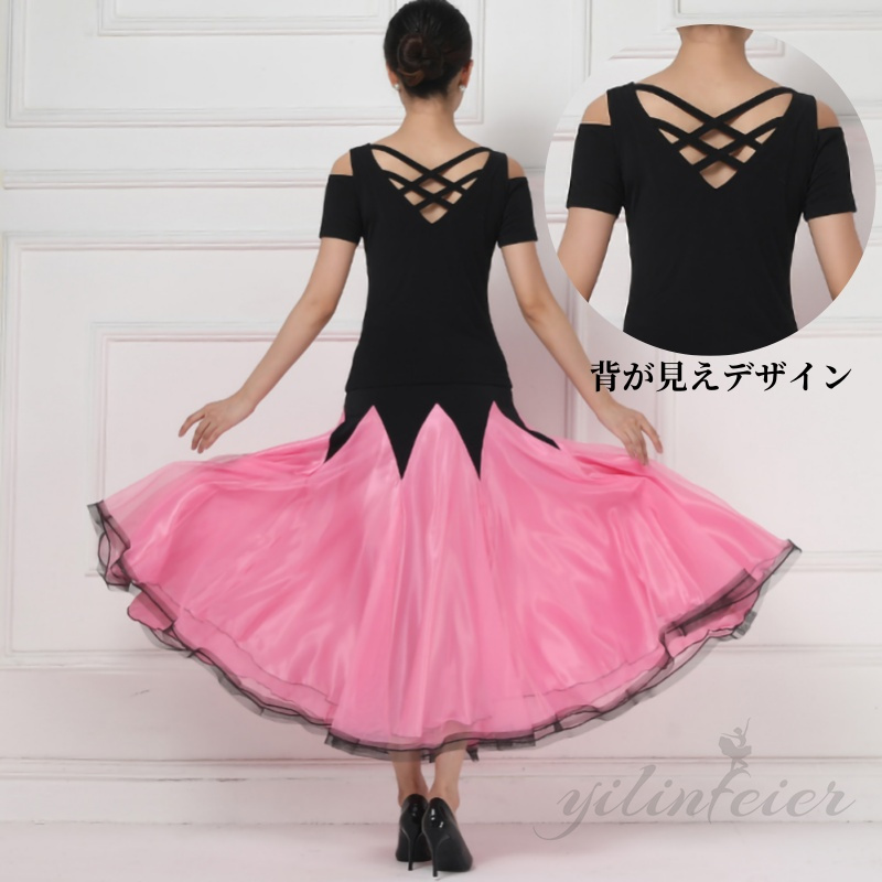★このセットは、エレガントなブラックのトップスと、動きやすさを考慮したデザインのピンク色スカートで構成されています。トップスの背面にはクロスされたストラップが施されており、スタイリッシュかつ機能的なアクセントを加えています。スカートは広がりやすい素材を使用しており、ダンス中のあらゆる動きを美しく演出します。ラテンダンスやモダンダンス、フラメンコなど、多岐にわたるダンススタイルに対応する汎用性の高さも魅力の一つです。