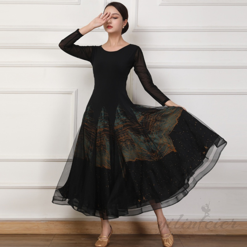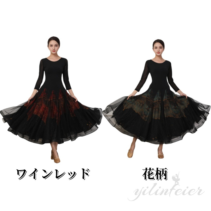 ★このダンスドレスは、その優雅さと機能性で、あらゆるダンスシーンに華を添えます。このドレスは、長袖と丸首のデザインが特徴で、動きやすさとスタイルを兼ね備えています。黒を基調としたボディに、色彩豊かなプリントが施されたスカート部分が、ダンスの各ステップで美しく広がります。