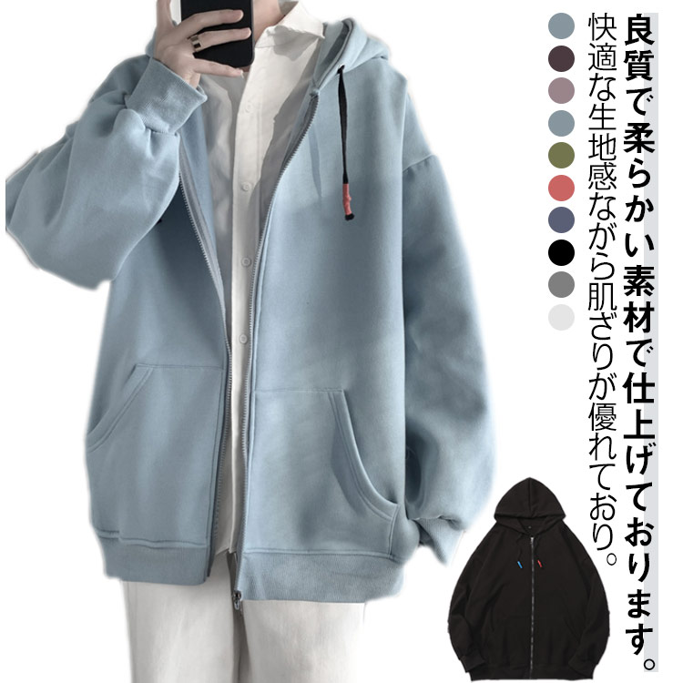 ジップ パーカー メンズ 秋服 オーバー 春服 冬服 レディース パーカー 無地 フード付き ポケット付き