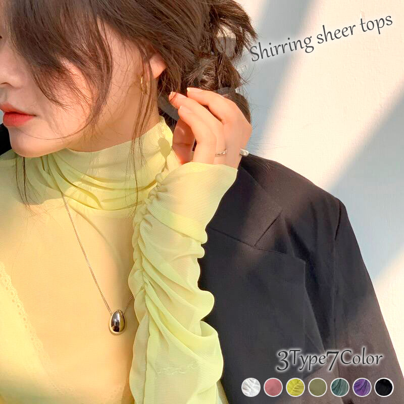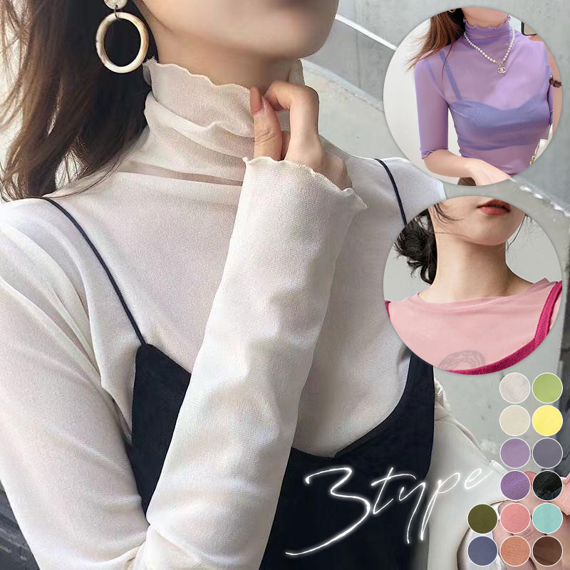 ☆3タイプ かわいい くしゅくしゅ袖 レイヤードスタイルに欠かせないシアーハイネック ☆透け感がなチュールレース
