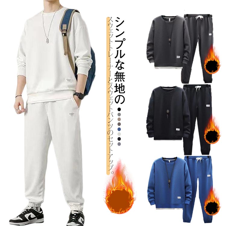 セットアップ メンズ 大きいサイズ 裏起毛 重ね着 おしゃれ クルーネック トレーナー ワッフル スウェットパンツ ルームウェア 2点