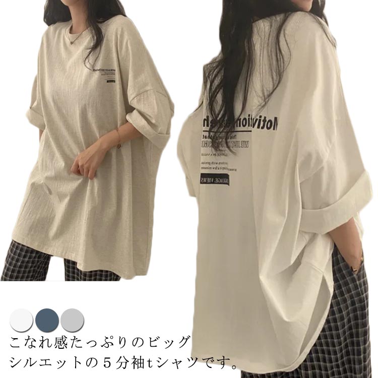 トップス ゆったり ビッグTシャツ カットソー ロゴ 五分袖 クルーネック オーバーサイズ 大きいサイズ