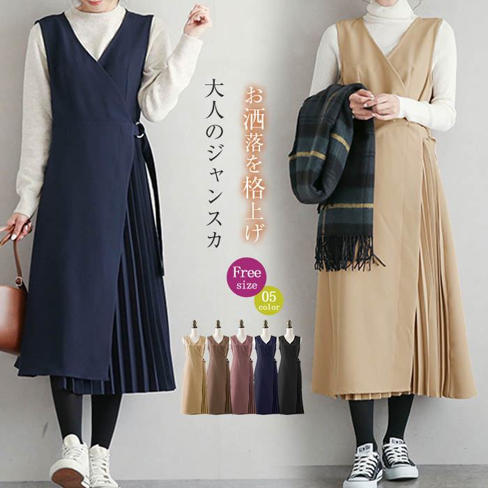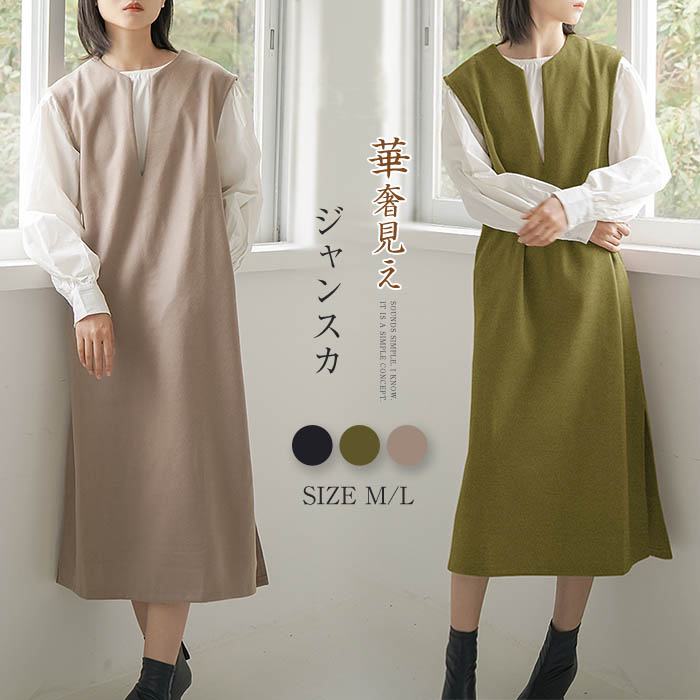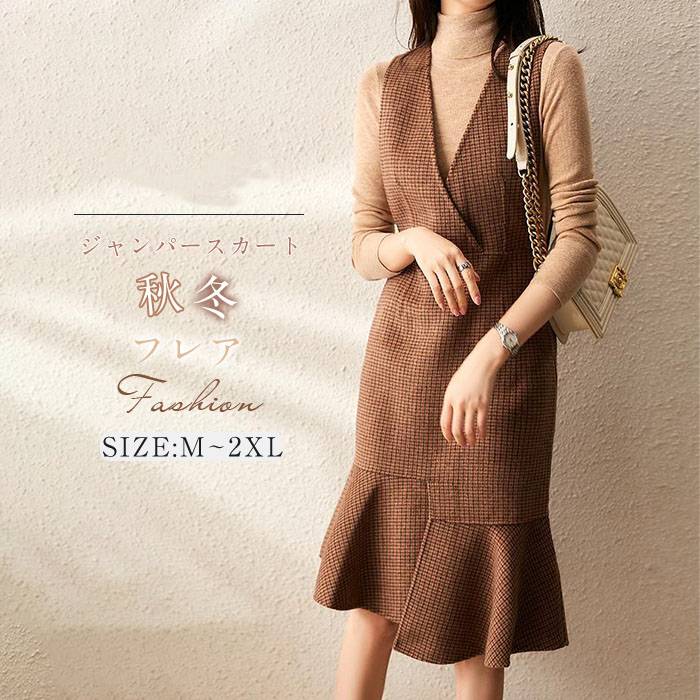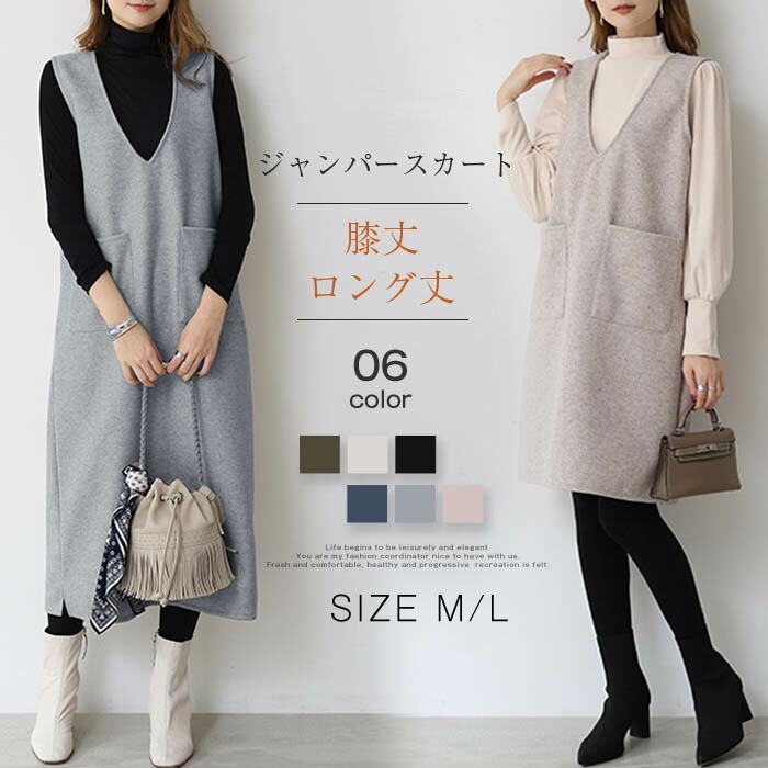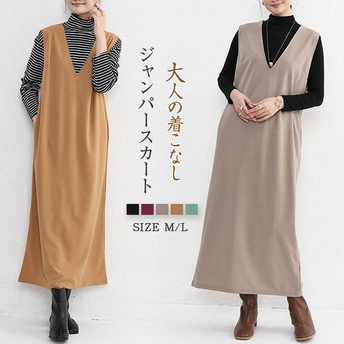 ジャンパースカート 秋 冬 ジャンスカ ワンピース Vネック 無袖 ベストワンピース 膝下 レディース ミモレ 秋 冬 シンプル カジュアル レイヤード キーネック きれいめ