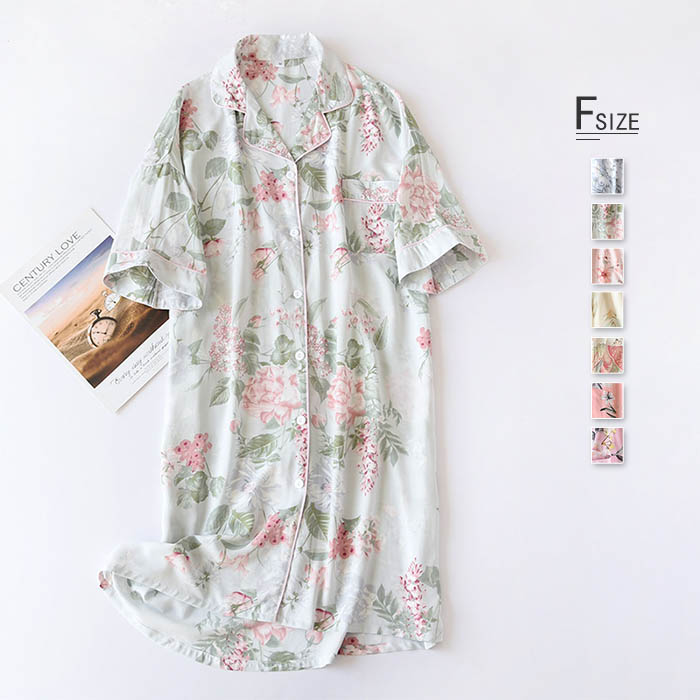 綿 ルームウェア 部屋着 ワンピース パジャマ レディース 前開き 半袖 花柄 総柄 大人 寝巻き ナイトウェア ゆったり コットン 春 夏 涼しい 柔らかい