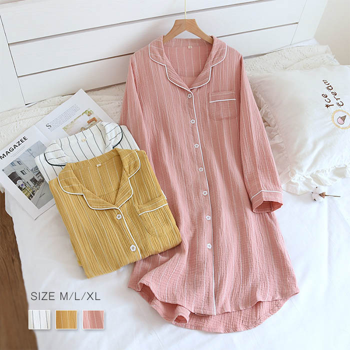 ガーゼ ルームウェア 部屋着 ワンピース パジャマ レディース ガーゼコットン ロングワンピース 綿 前開き 長袖 ストライプ 配色 大人 ダブルガーゼ 2重ガーゼ