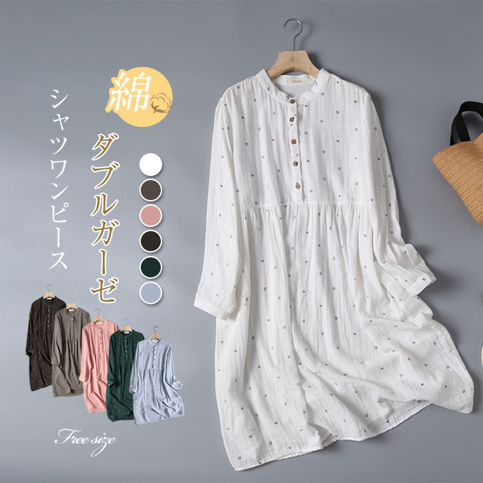 綿 ワンピース レディース 長袖 シャツワンピース シャツ ワンピース aライン フレア コットンワンピース ガーゼワンピース フレアワンピース aラインワンピース ボタン ゆったり