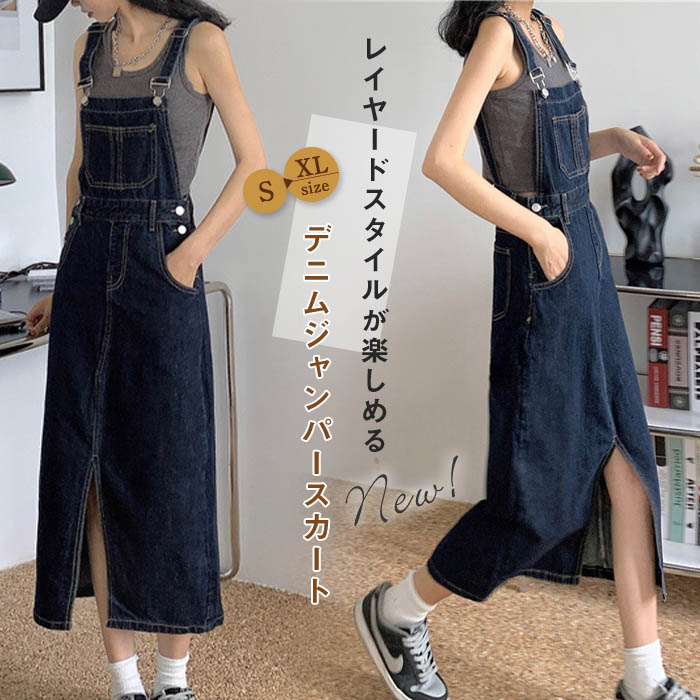 デニム ジャンパースカート 夏 春秋 デニム ジャンパースカート デニム ワンピース ロング ジャンパースカート 大人 春夏 ノースリーブ ボタン 重ね着 レイヤード コーデ