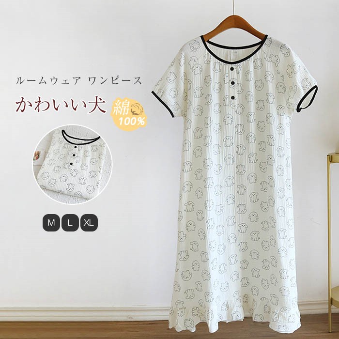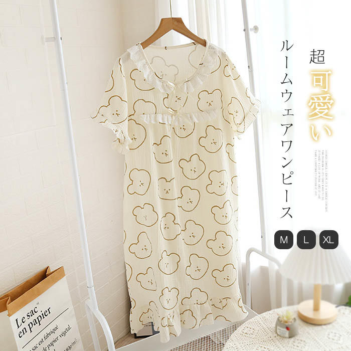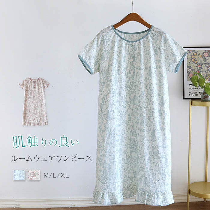 ガーゼ綿100% ワンピース ルームウェア 半袖 夏 プルオーバー ガーゼ ランジェリー 部屋着 ワンピース パジャマ レディース ナイト 大人 寝巻き ナイトウェア ゆったり コットン 可愛い