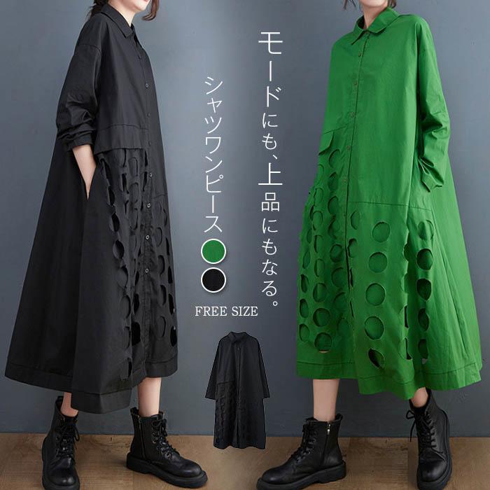 纏うだけでモードな雰囲気高まる、シャツワンピース カットワーク シャツ ワンピース 長袖 シャツワンピース ロング ラインワンピース フレアワンピース ロングワンピース おしゃれ