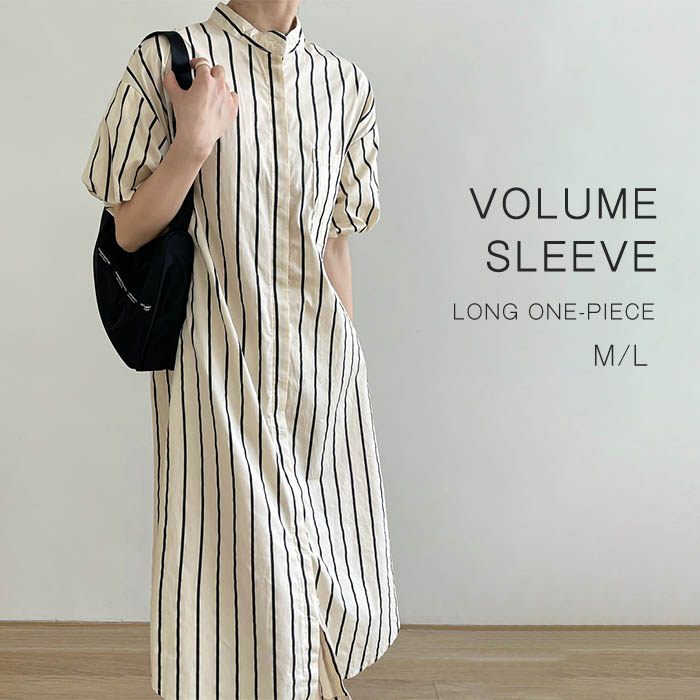 ワンピース レディース 半袖 夏 ロングワンピース ストライプ エレガント パフ袖 パフスリーブ ライン ゆったり 大きいサイズ カジュアル ポケット付き 大人 シャツワンピース