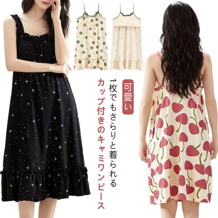 ワンピ キャミソールワンピ ネック キャミソールワンピース ワンピース キャミ カップ付 ロング丈 袖なし 丈 膝下 カップ付 寝巻き 楽ちん 大きいサイズ 柄 総柄 キャミソール