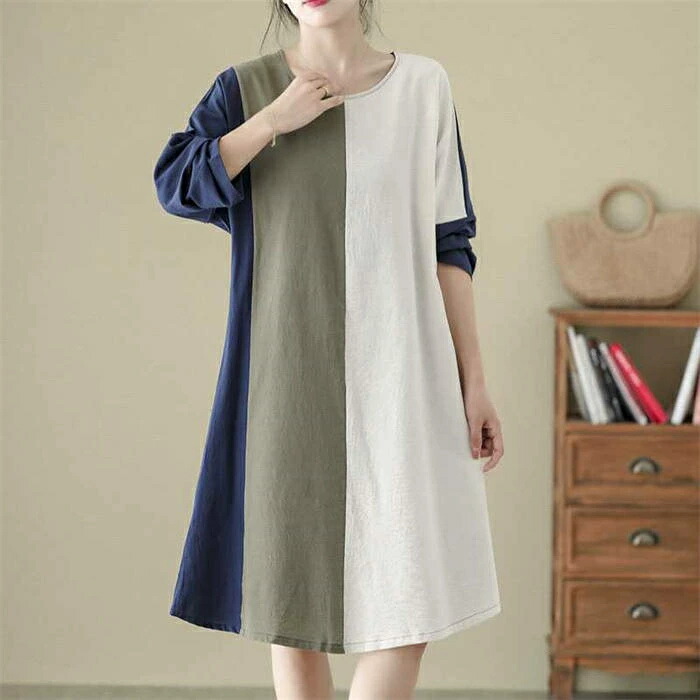 ワンピース レディース 新作 長袖 綿麻 コットン リネン ワンピ ラウンドネック プルオーバー デザイン感 無地 配色 春 秋 aライン 綿 コットンリネン レトロ 通勤