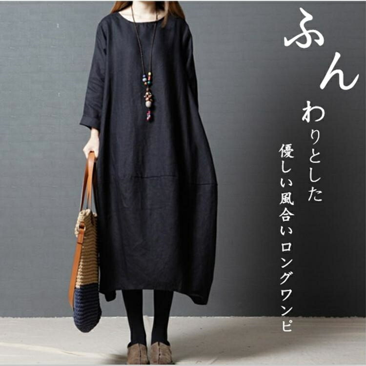 リネンワンピース 綿麻 亜麻 混 ボートネック バルーンシルエット 長袖 ロング丈 無地 ワンピ レディース 春 夏