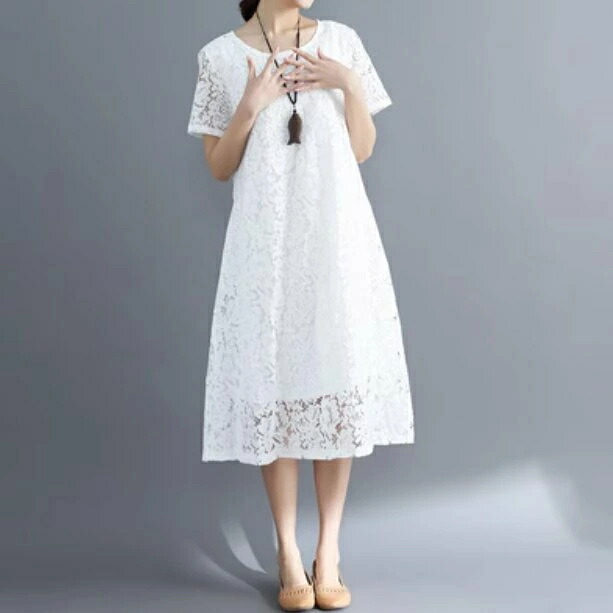 スカート ワンピース プルオーバー ドレス レディース シャツワンピ ロングスカート レーススカート ミモレ 半袖 ラウンドネック 襟なし ノーカラー ワイド レースアップ 透け感