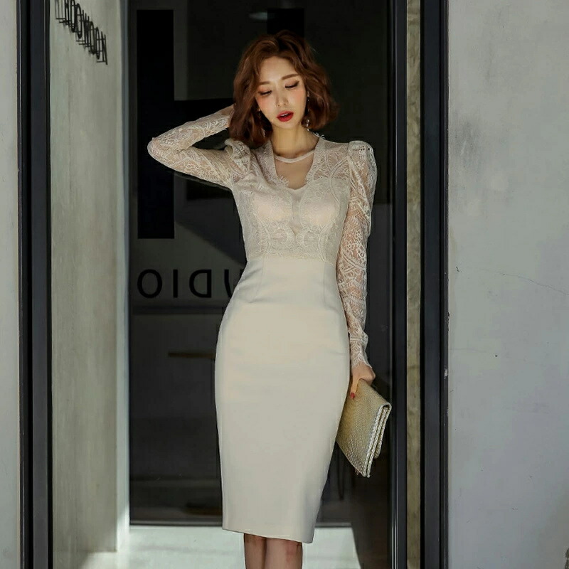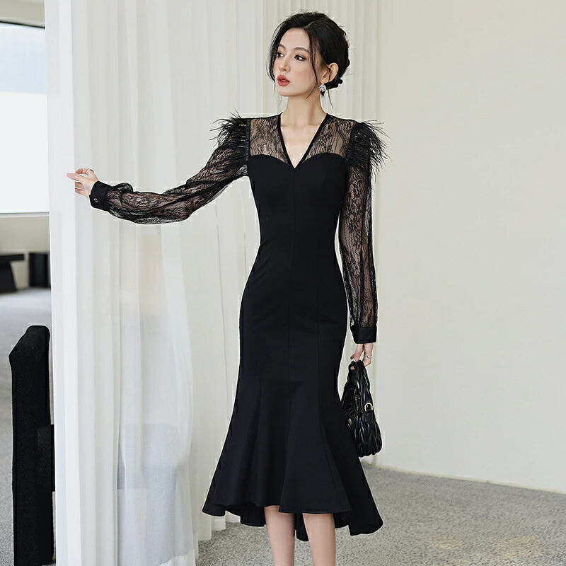 ロングワンピース 新作 タイトワンピース 姫系ワンピース レース シフォン ワンピース インポート パーティー お嬢様 セクシー 長袖 ミディアム丈 二次会 韓国ファッション