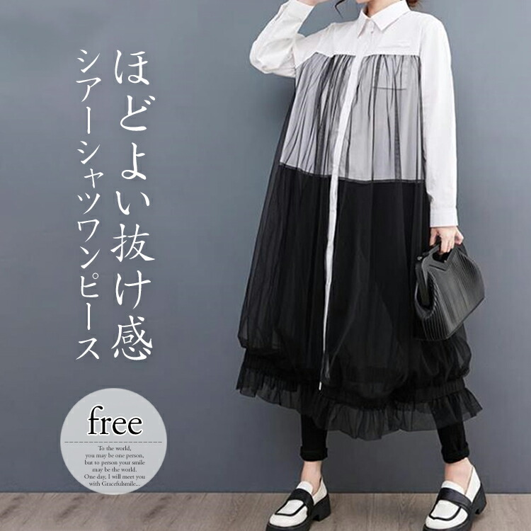シャツワンピース レディース 長袖 シアー異素材 モノトーン黒白 秋 冬 春 夏 透け感 きれいめ 上品 きれいめ レース 大人かわいい通勤 オフィス お出かけ デートコーデ 旅行 お呼ばれ 透け感
