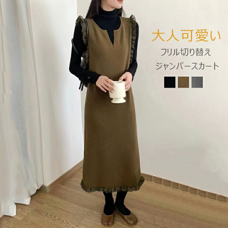ゆったり着れる肩のフリルが魅力的なジャンパースカート♪ シフォン 大人可愛い カジュアル ニットジャンパースカート ストレッチ
