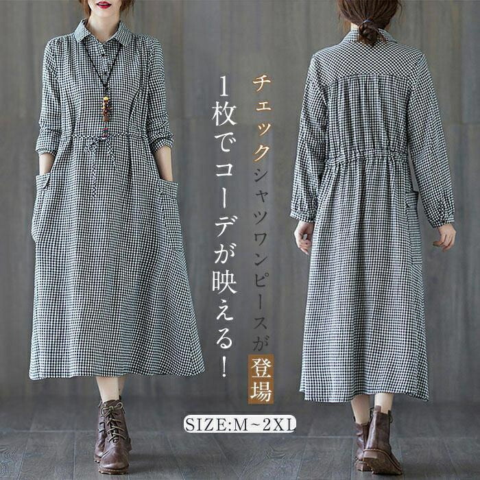 ワンピース 長袖 シャツワンピース ロング 長袖 ギンガムチェック レディース ロングシャツワンピース ワンピ ロングワンピ ウエストひも たっぷりギャザー ゆったり 大人