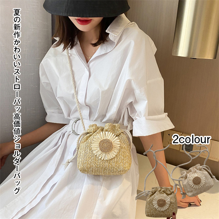 手織りストローバッグ かご ショルダーバッグ 草編みバッグ 斜めがけ レディース 手提げ 巾着 クラン かごバッグ かごバッグ 草編みバッグ 編みバック 手提げバッグ 花飾り