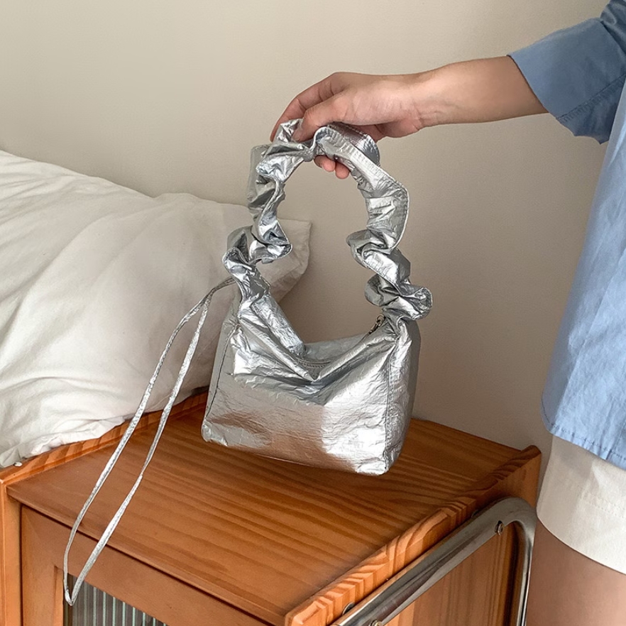 ドロストギャザーバッグ ギャザーバケットバッグ ミニハンドバッグ シルバー レディースバッグ おしゃれ 大人可愛い