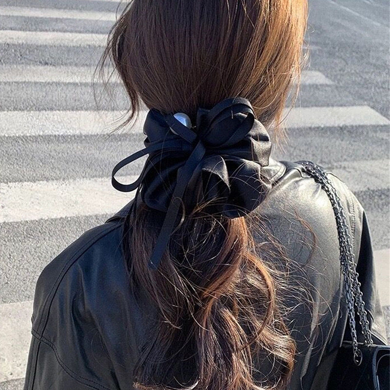 ビッグシュシュ パールシュシュ ヘアゴム ロングリボン ボリューム サテン ブラック おしゃれ 大人可愛い レディースヘアアクセサリー