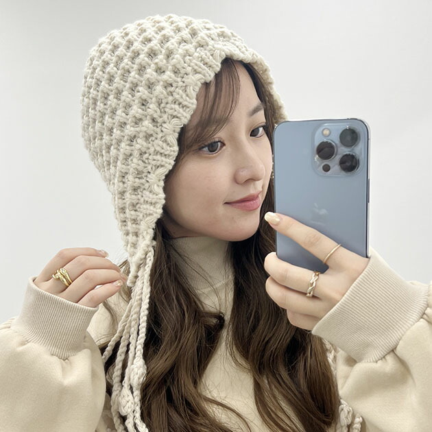 ソリッドカラー 耳付き フリンジ ニット ワッチ 女性 レディース 帽子 キャップ ビーニー 秋 冬 防寒 保温 耳当て 単色 無地 ローゲージ カジュアル フォークロア 民族 小顔効果 ゆったり 可