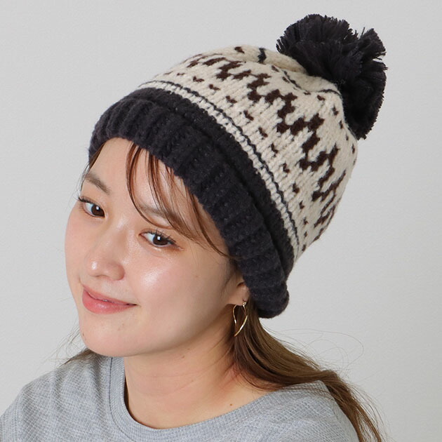 ビッグ ポンポン付き ノルディック柄 ニット キャップ 女性 レディース ユニセックス 帽子 ワッチ ビーニー 秋 冬 防寒 保温 配色 民族 カウチン トライバル カジュアル ストリート ゆったり