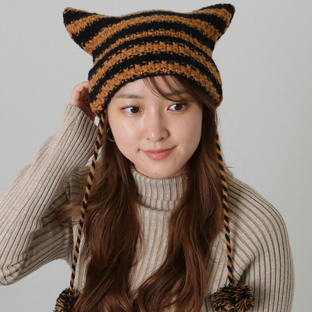 ポンポン付き 配色 ボーダー 猫型 ニット キャップ 女性 レディース 帽子 ワッチ ビーニー 秋 冬 防寒 保温 バイカラー カラフル ポップ 耳 アニマル キャット セーター ソフト シンプル カ