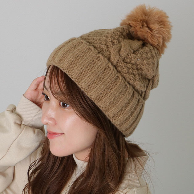 ビッグ ファー ポンポン付き ケーブル ニット ワッチ 女性 レディース 帽子 キャップ ビーニー 秋 冬 防寒 保温 ソフト あったか 単色 シンプル ボリューム カジュアル ストリート 可愛い キ